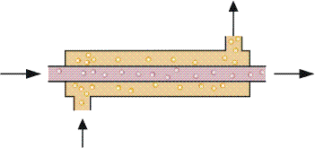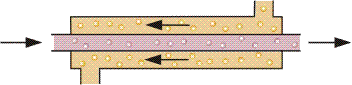 In cocurrent flow heat exchangers, the streams flow parallel to each other and in the same direction as shown in Cocurrent Flow, This is less efficient than countercurrent flow but does provide more uniform wall temperatures.