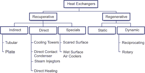 There are many types of recuperative exchangers, which can broadly be grouped into indirect contact, direct contact and specials. Indirect contact heat exchangers keep the fluids exchanging heat separate by the use of tubes or plates etc.. Direct contact exchangers do not separate the fluids exchanging heat and in fact rely on the fluids being in close contact.